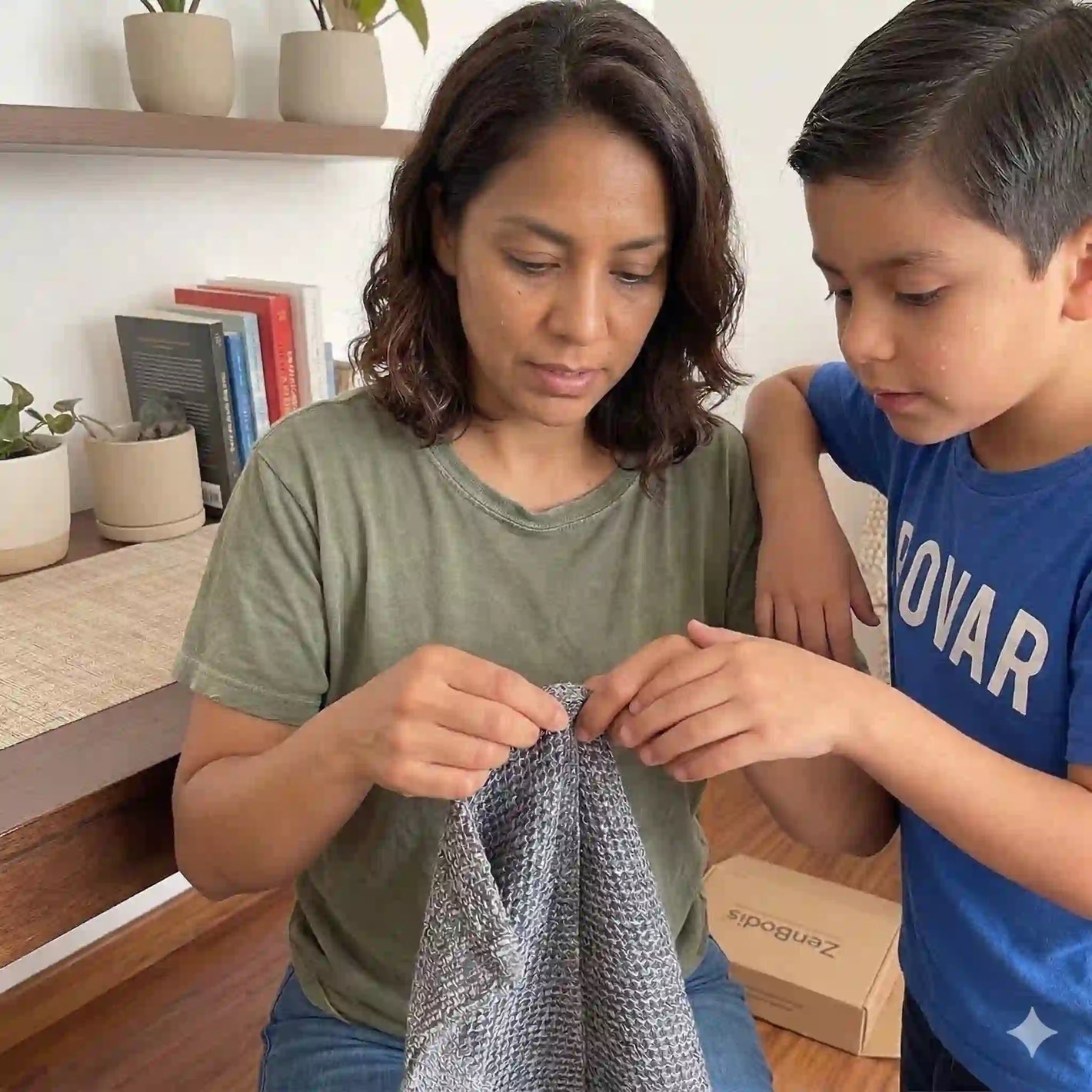 Al aplicar la fricción controlada de ZenBodis, el entramado del tejido técnico rompe la barrera invisible de grasa y células muertas que las manos no pueden retirar.